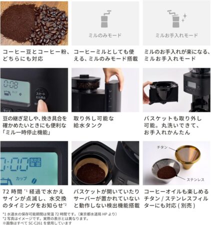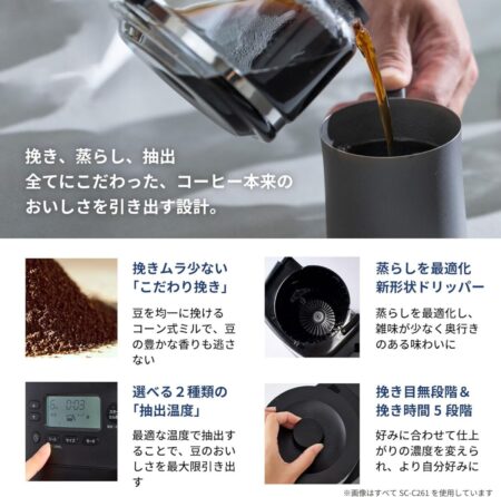 SC-C281は、コーン式ミル、無段階の挽き目調整、蒸らし機能、ミルのみモードを備えています。