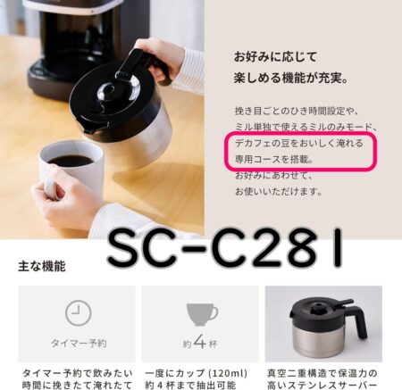 SC-C281は、4杯までで足りる人に向けて、ステンレスサーバーとデカフェモードを載せたモデルです。