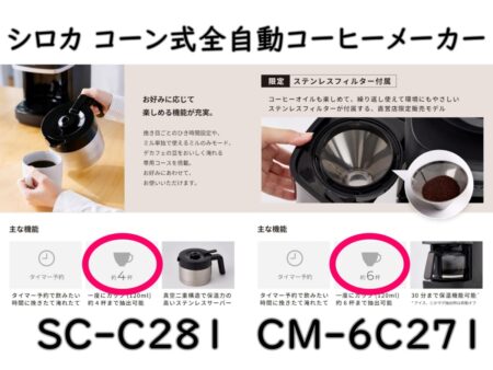 結論からいうと、一度に4杯までで十分ならSC-C281、家族用や来客分までまとめて淹れたいならCM-6C271が本命です。