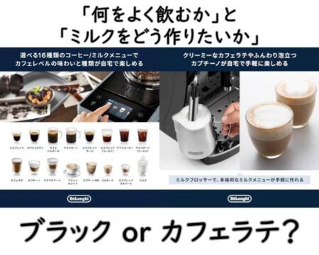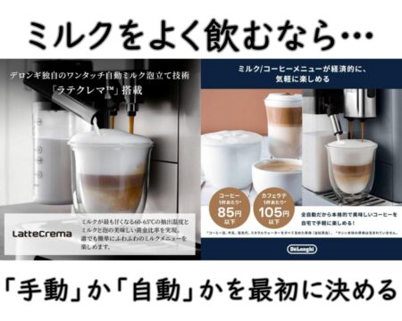 デロンギ全自動の価格差に直結しやすいのが、ミルクを自分でスチームして泡立てるか、ラテクレマでボタン1つに任せるかの違いだからです。
