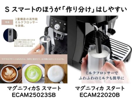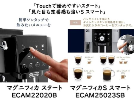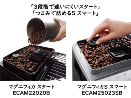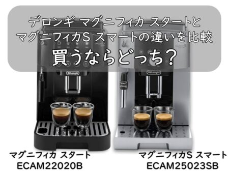 この記事では、マグニフィカ スタート ECAM22020BマグニフィカS スマート ECAM25023SBの違いを、操作性、ブラック系メニュー、豆量調整、ミルクの扱い、サイズ、価格感、向いている人で整理していきます。