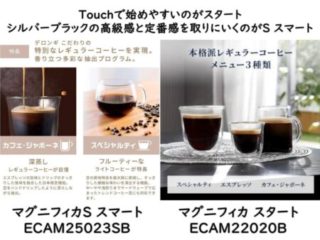 マグニフィカ スタートとマグニフィカS スマートの違いをひとことで言うなら、Touchで始めやすいのがスタート、シルバーブラックの高級感と定番感を取りにいくのがS スマートです。