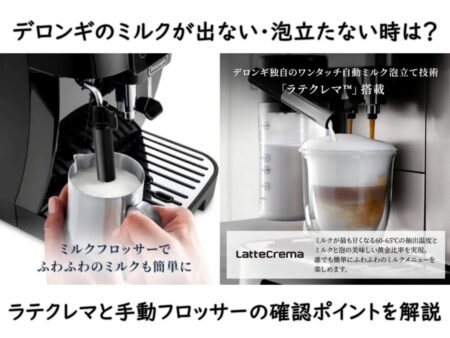デロンギのミルクが出ない・泡立たない時は、まずラテクレマ搭載機か、手動フロッサー機かを分けて考えるのが近道です。