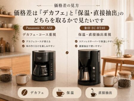 迷ったら、「デカフェや味の作り込みを取りたいか」「保温と直接抽出のラクさを取りたいか」で考えると決めやすいです。