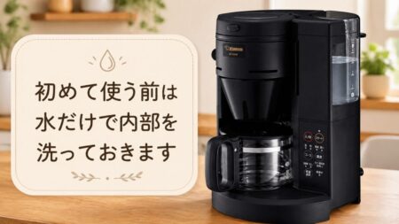 取扱説明書でも、初めて使うときや長期間使っていなかったときは、各部品を洗い、水だけでドリップして内部を洗浄する流れが示されています。