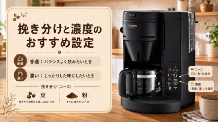味が薄く感じたら濃度を「濃い」に、苦味や重さを感じたら粗挽きや豆の種類を見直すと、自分の好みに寄せやすくなります。