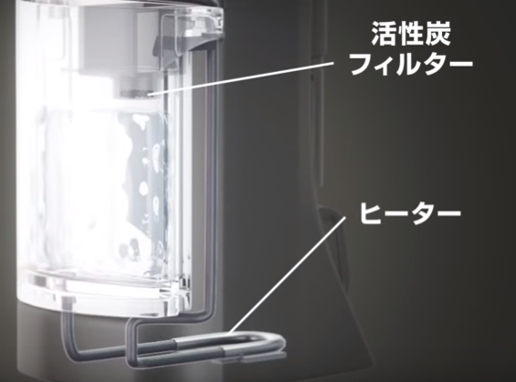 沸騰したお湯はコーヒーメーカー上部へと引き上げられると、もう一度活性炭フィルターの付いた水タンクへ戻されて、水タンク→ヒーター→水タンクと、お水が循環することで浄水する仕組みになっています。