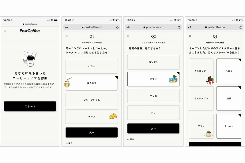 「コーヒー診断」といって、一見コーヒーとは関係なさそうな10個の質問に答えると、AIが自分の潜在的な好みに合ったスペシャリティコーヒーを選んでくれます。